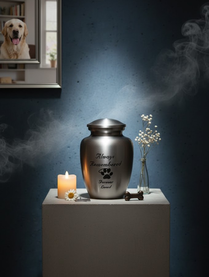 This 6-inch pet urn is made from aluminium with a matte, polished finish. The urn has an elegant, classic shape with a simple dome-shaped lid. The front of the urn is engraved with the heartfelt message, "Always Remembered" at the top, followed by a small paw print graphic, and "Forever Loved" at the bottom. |