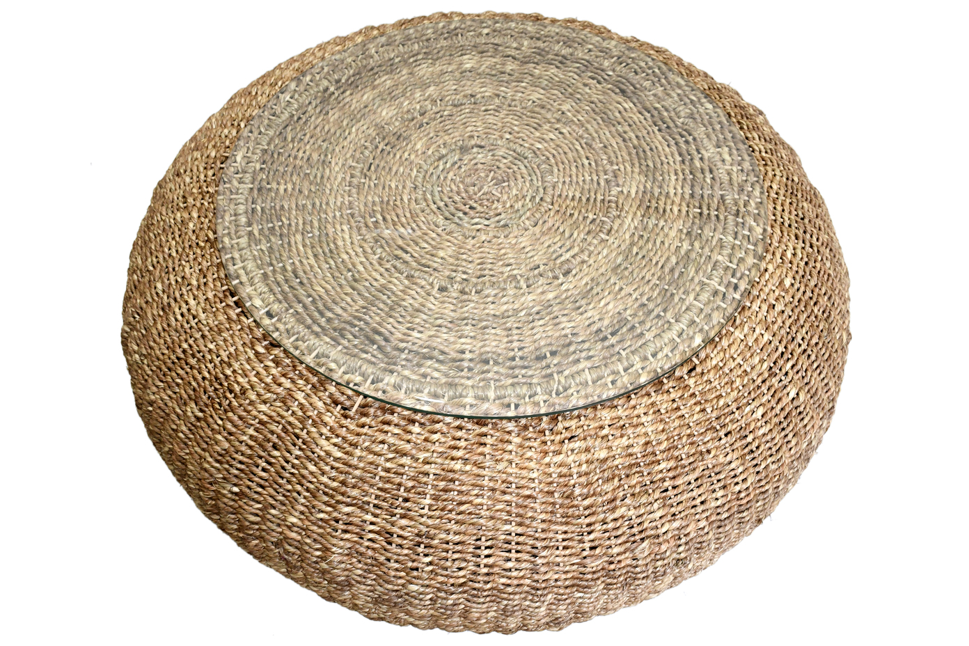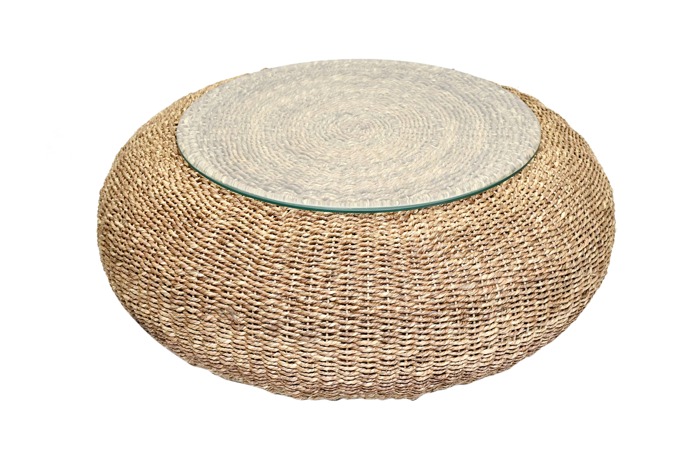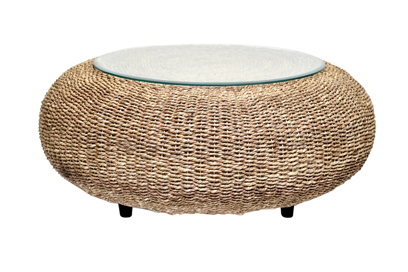 This Round coffee table infuses your living area with a natural, coastal ambiance, thanks to its combination of water hyacinth rope and rattan details. The round shape is highlighted by a weathered finish available in either natural or walnut tones, making it suitable for various decor styles. Equipped with a tempered glass top, it is ideal for serving drinks and is easy to maintain. The splayed wooden legs contribute to its mid-century aesthetic. Additionally, with a weight capacity of 50 lbs., it serves as a functional centerpiece for your living room or family den.