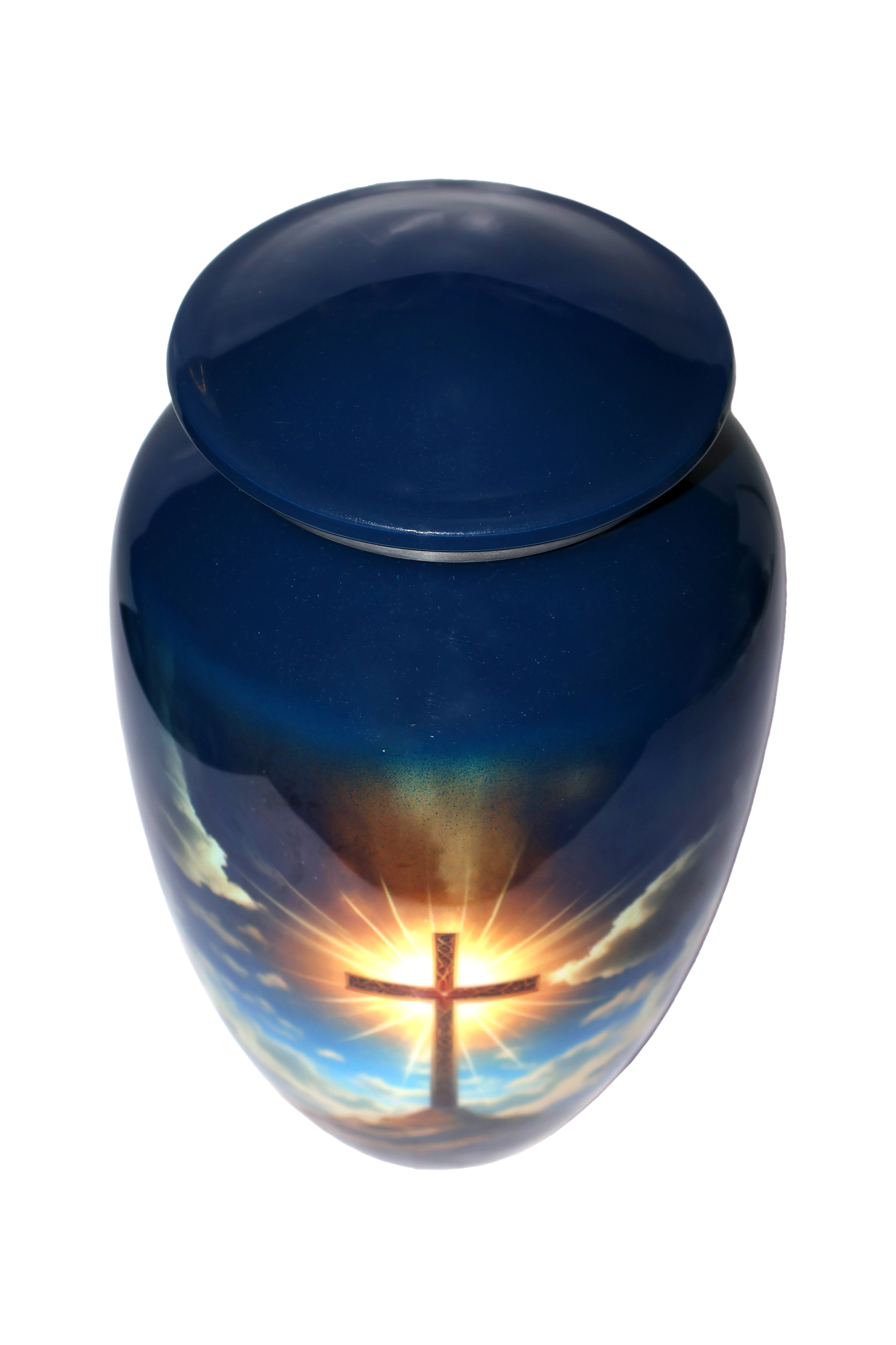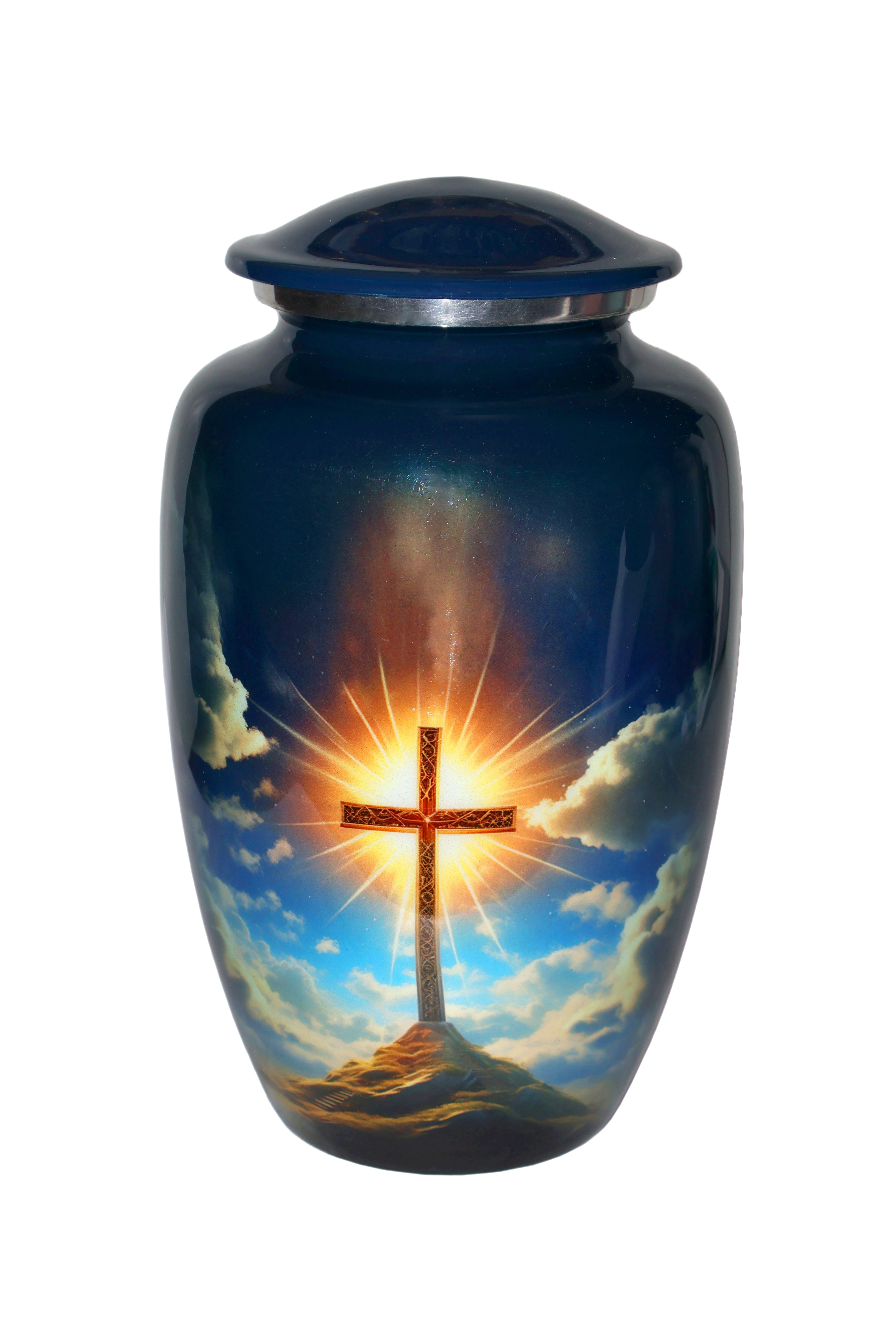 Heavenly Cross Cremation Urn – Adult Size Honor your loved one’s faith and memory with this beautifully crafted Heavenly Cross Cremation Urn. Featuring a radiant cross illuminated by golden light against a peaceful sky, this urn symbolizes eternal love, hope, and spiritual comfort. Made from high-quality metal with a glossy midnight-blue finish, it offers both durability and elegance. The secure threaded lid ensures safe closure, making it a lasting tribute to your loved one’s life and faith. |