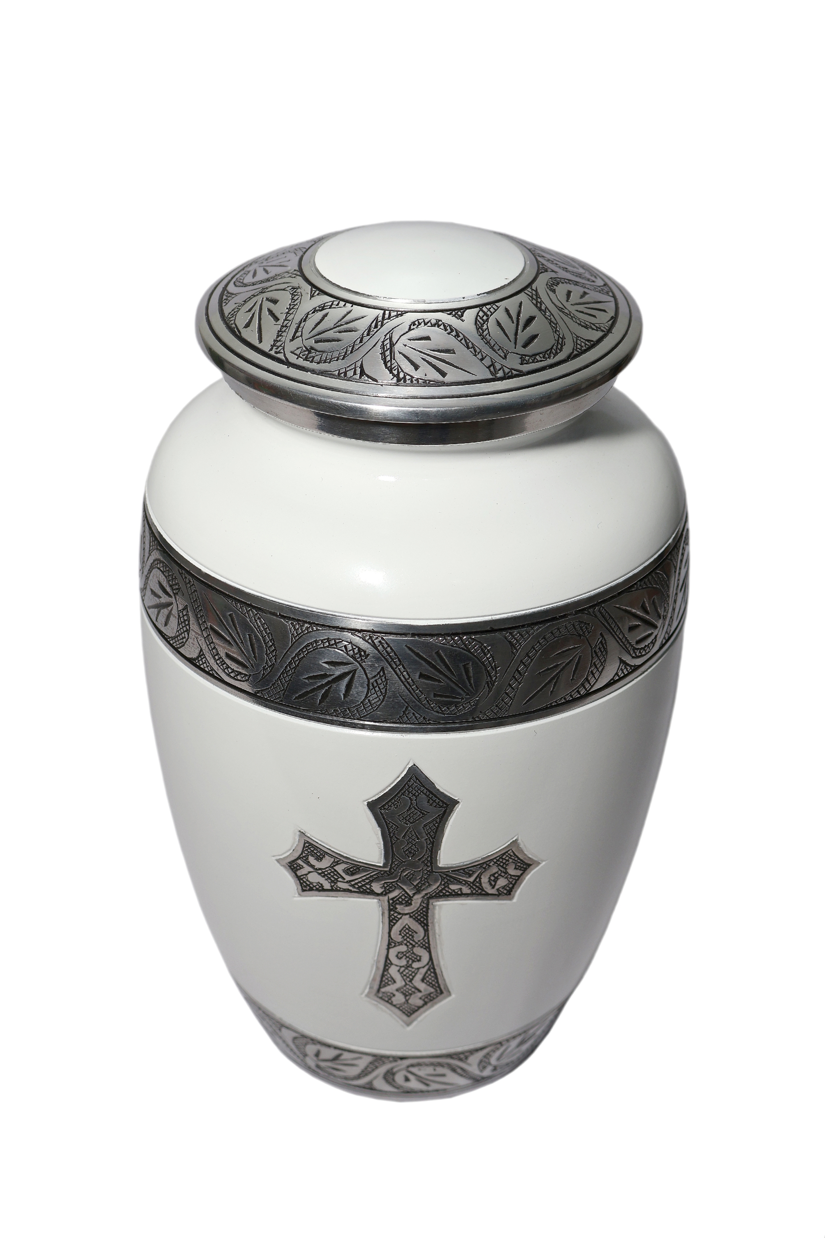 Elegant White and Silver Cross Memoria Urn This striking memoria urn is a beautiful and reverent tribute to a loved one. Crafted from high-quality aluminum, it features a smooth, serene white finish that provides a striking contrast to the detailed, antique silver-plated accents. The urn is centered with a prominent, intricate cross design, serving as a powerful symbol of faith and devotion. This central emblem is framed by two bold silver-plated bands that wrap around the circumference of the urn. These bands, along with the matching accents on the lid and base, are meticulously engraved with a continuous leaf and vine pattern, creating a unified and dignified aesthetic. This urn offers both a respectful resting place and a beautiful, enduring piece of remembrance decor. |