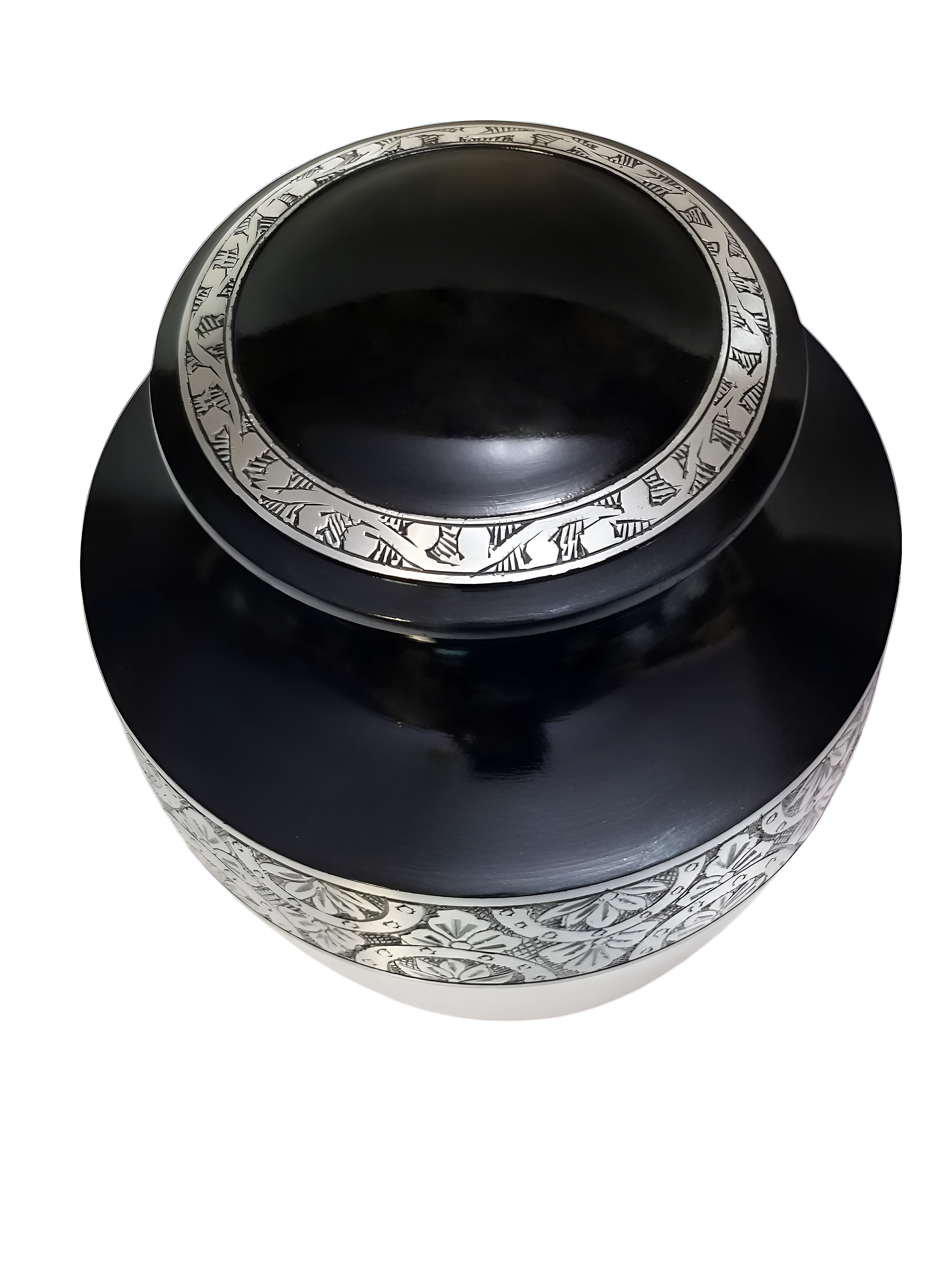 10-Inch Black and White Aluminum Urn with Engraved Band This striking, full-sized aluminum urn features a bold two-tone design, contrasting a glossy jet black upper body and threaded lid with a smooth, bright white lower body. The centerpiece is a wide, antiqued pewter-tone band separating the colors, which is meticulously detailed with a continuous floral or mandala-style engraving. The finish is completed with a sleek silver-tone base, creating a modern yet classic tribute piece. |