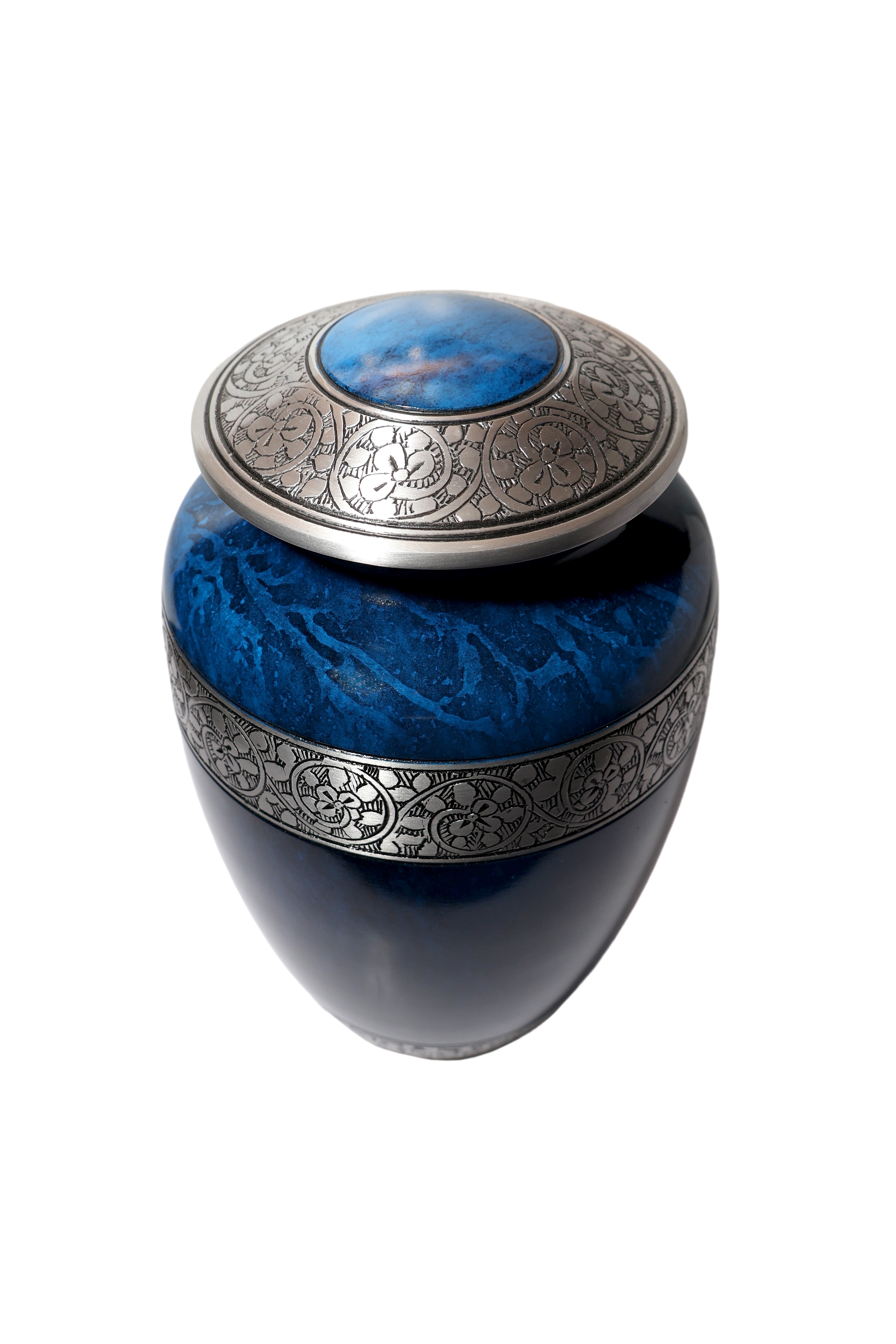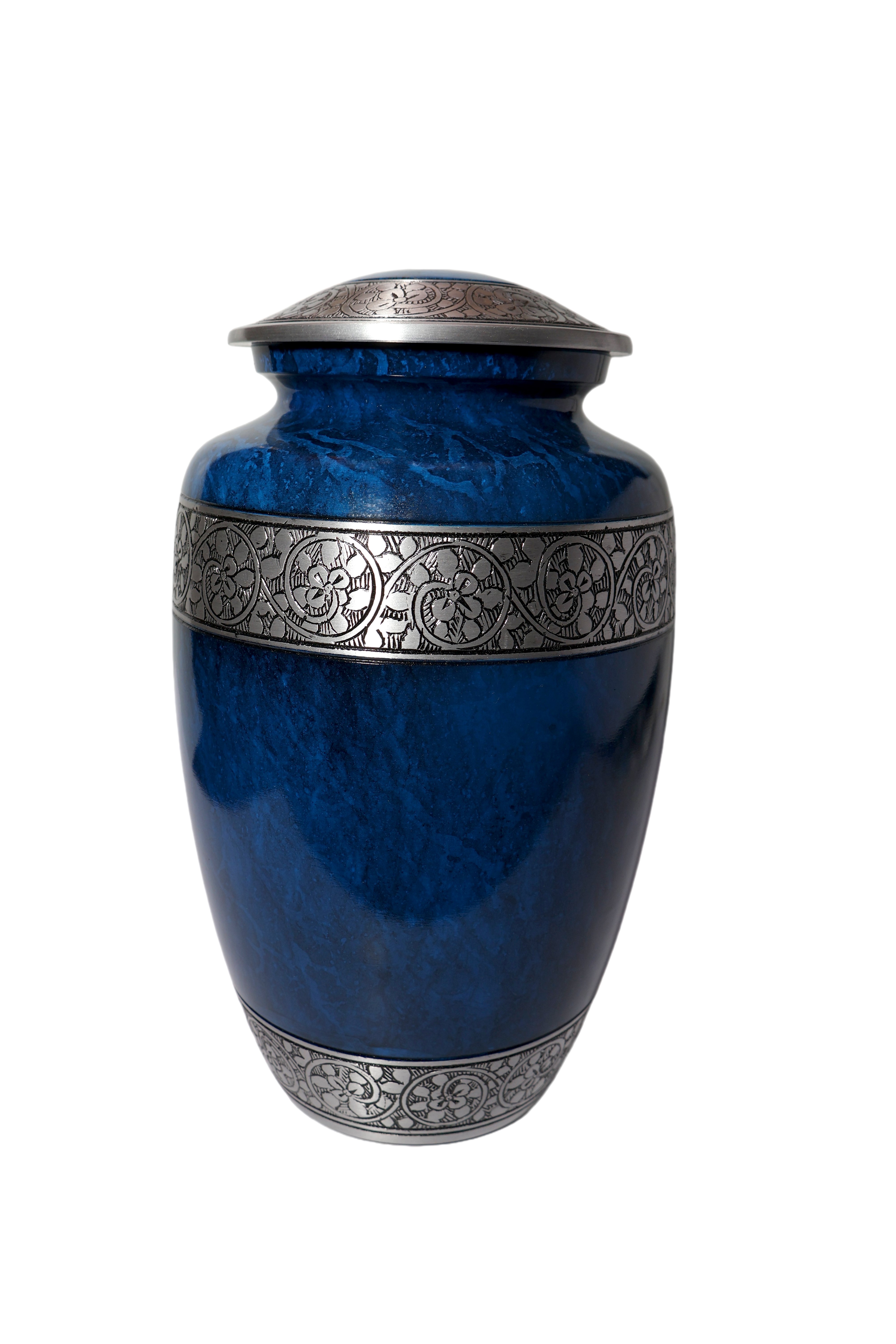 This exquisite, full-sized aluminum urn features a high-gloss, deep sapphire blue finish with a rich marble-like swirling effect over the body. The intense color is elegantly contrasted by wide antiqued pewter-tone bands on the threaded lid, mid-section, and base. Both the lid and the central band are intricately detailed with an engraved repeating floral or scroll motif, creating a luxurious, enduring tribute.