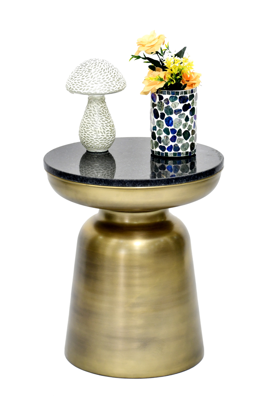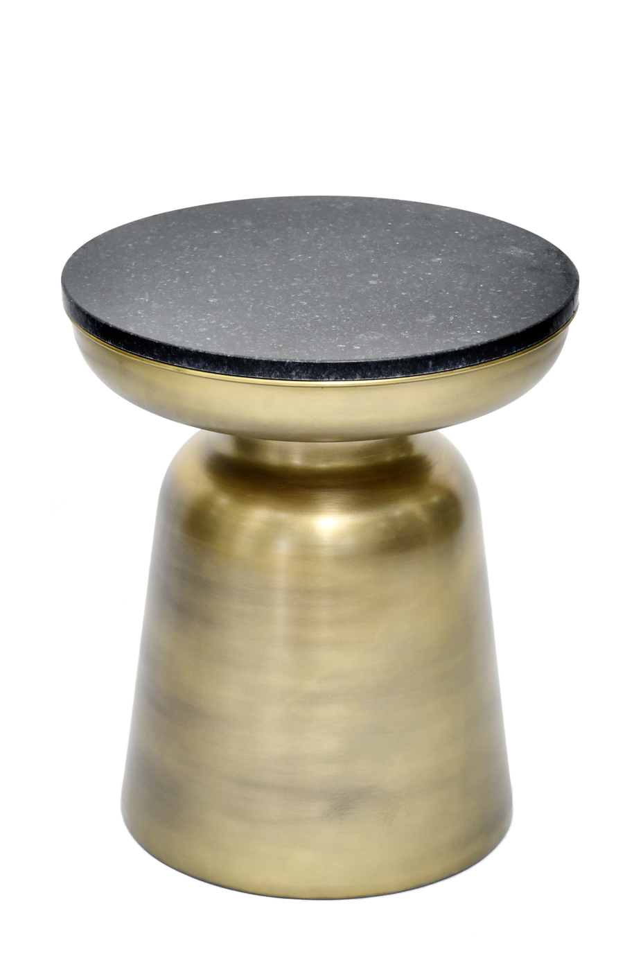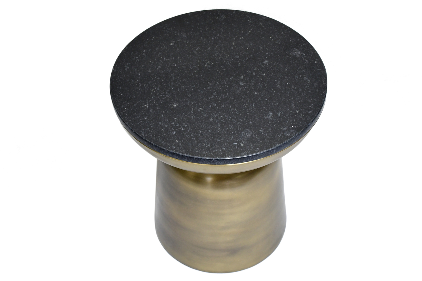 A refined round side table with a polished black stone top featuring subtle speckling and a flared brushed-brass metal base. The contrast of dark stone and warm metal creates a modern, luxe look with stable, gallery-worthy presence.