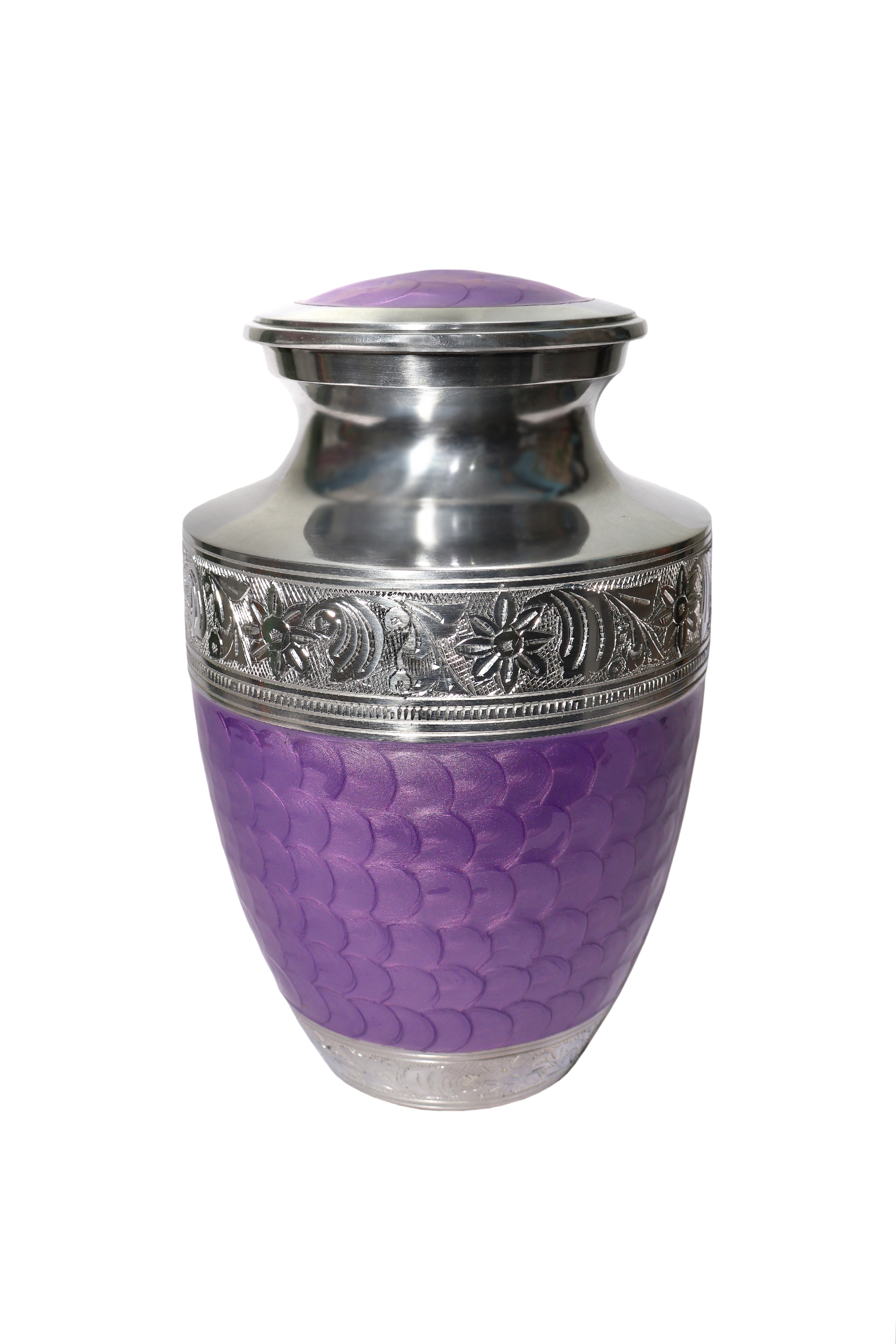 10-Inch Lilac and Silver Aluminum Cremation Urn This vibrant, full-sized aluminum urn features a bright lilac/purple lower body with a textured, scale-like pattern. The upper section and threaded lid are finished in highly polished silver-tone. A wide silver band separates the two sections, featuring a deeply engraved floral and vine motif. This durable and colorful urn provides an elegant, lasting memorial. |