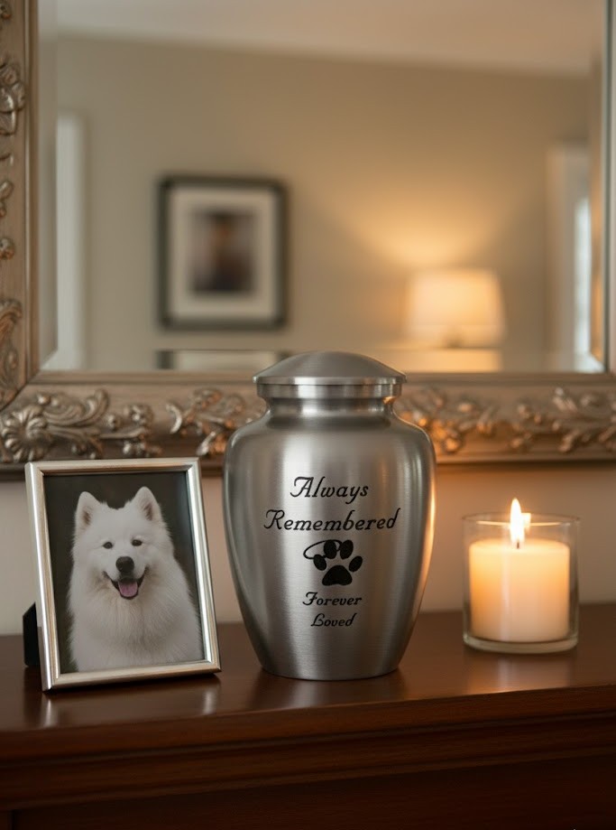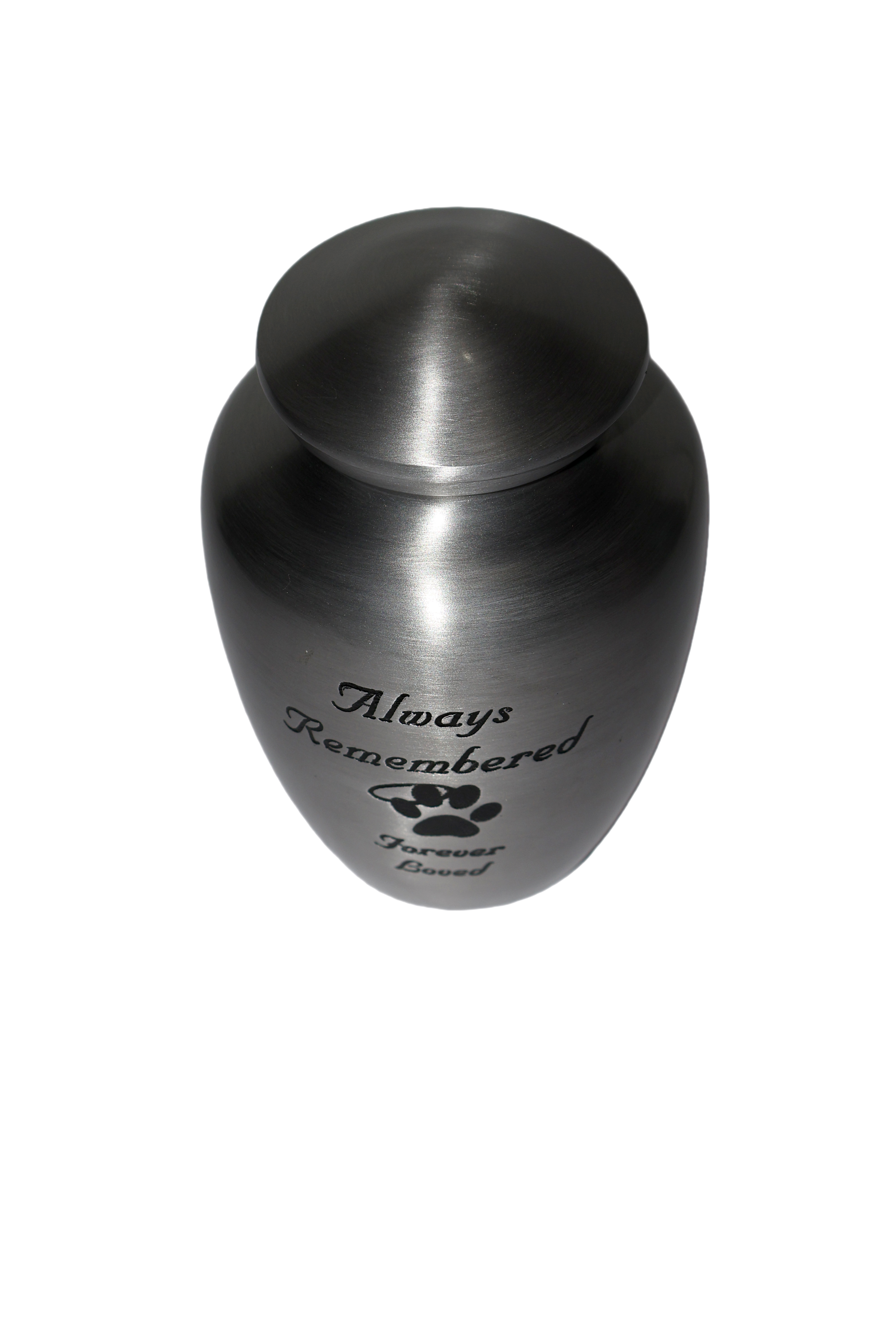 | This 6-inch pet urn is made from aluminium with a matte, polished finish. The urn has an elegant, classic shape with a simple dome-shaped lid. The front of the urn is engraved with the heartfelt message, "Always Remembered" at the top, followed by a small paw print graphic, and "Forever Loved" at the bottom. |