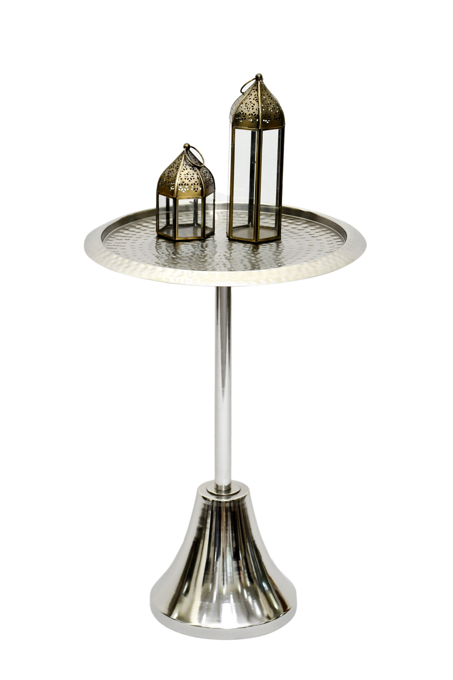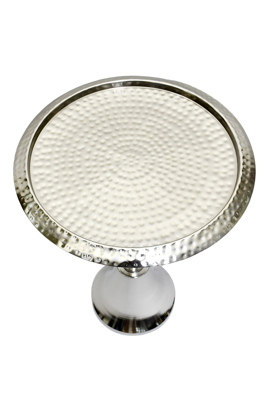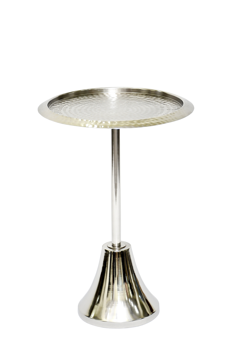 Bring modern elegance and artisanal charm to your space with the Marlo Metal Side Table. Expertly handcrafted from durable metal, it features a sleek silhouette with a flared pedestal base finished in lustrous silver metal. The round tabletop showcases a hand-hammered texture, adding a unique visual dimension and artisanal appeal. Compact yet sturdy, this versatile table is perfect for small spaces and functions beautifully as a side table, nightstand, or accent piece—ideal for holding drinks, books, or decorative items.