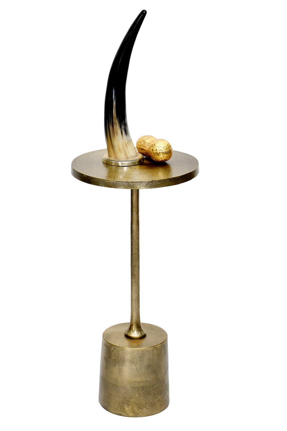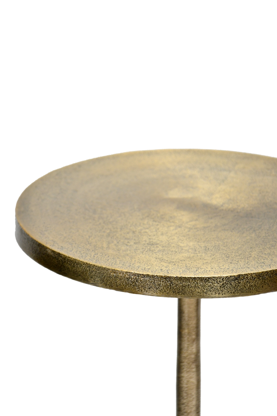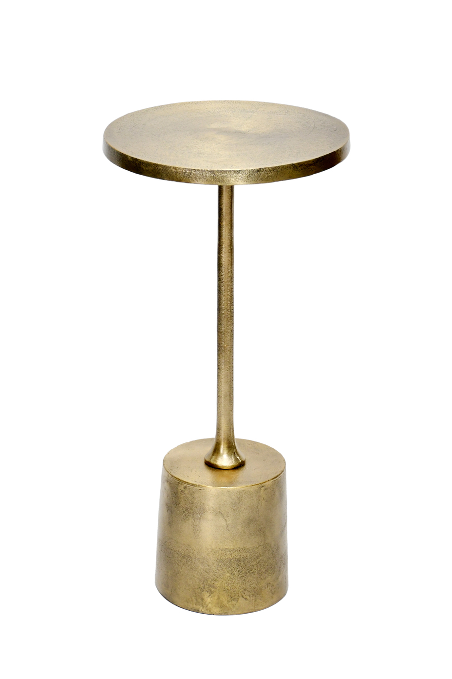 Bring timeless elegance to your home with this Antique Brass Accent Side Table. Crafted from durable aluminum with a warm antique brass finish, it combines minimal design with vintage charm. The round top rests on a slender stem and tapered base, creating a sleek yet stable silhouette.