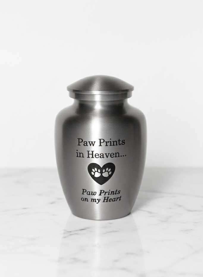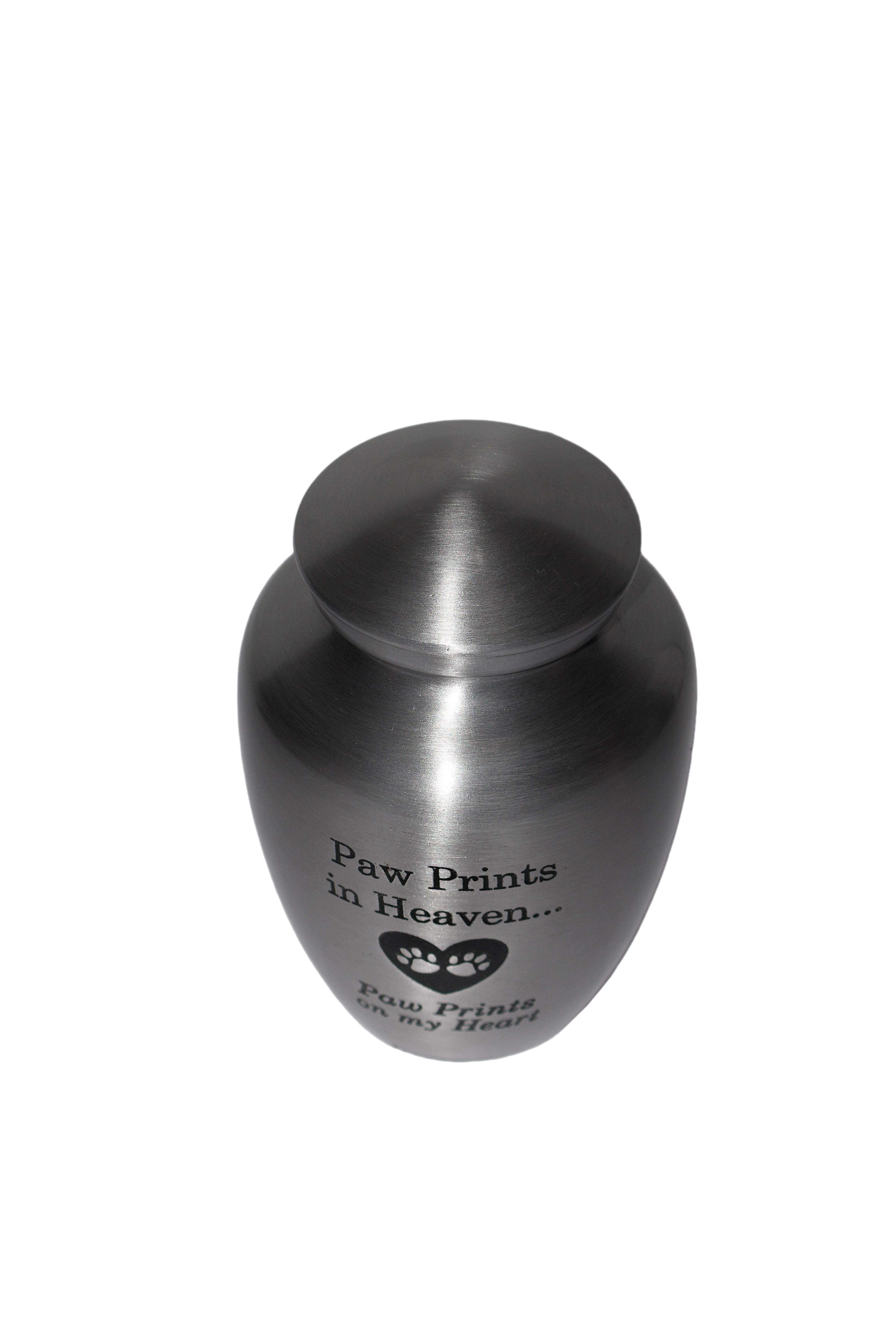 | This 6-inch pet urn is made from aluminium with a matte, polished finish. The design is simple and elegant, with a smooth, dome-shaped lid. The front of the urn features an engraving that reads, "Paw Prints in Heaven..." with a paw print inside a heart, and "Paw Prints on my Heart" below it. |