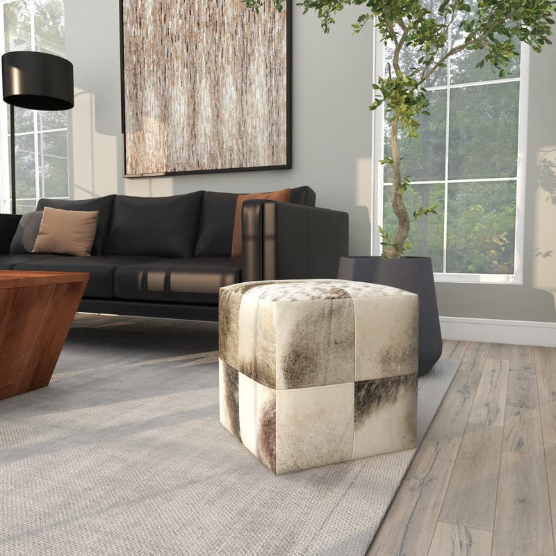Elevate your living space with our modern leather poufs. Made with real cowhide, each pouf boasts a unique patchwork design and visible stitching for a stylish touch. Experience the benefits of a stunning display and luxurious comfort in one piece.