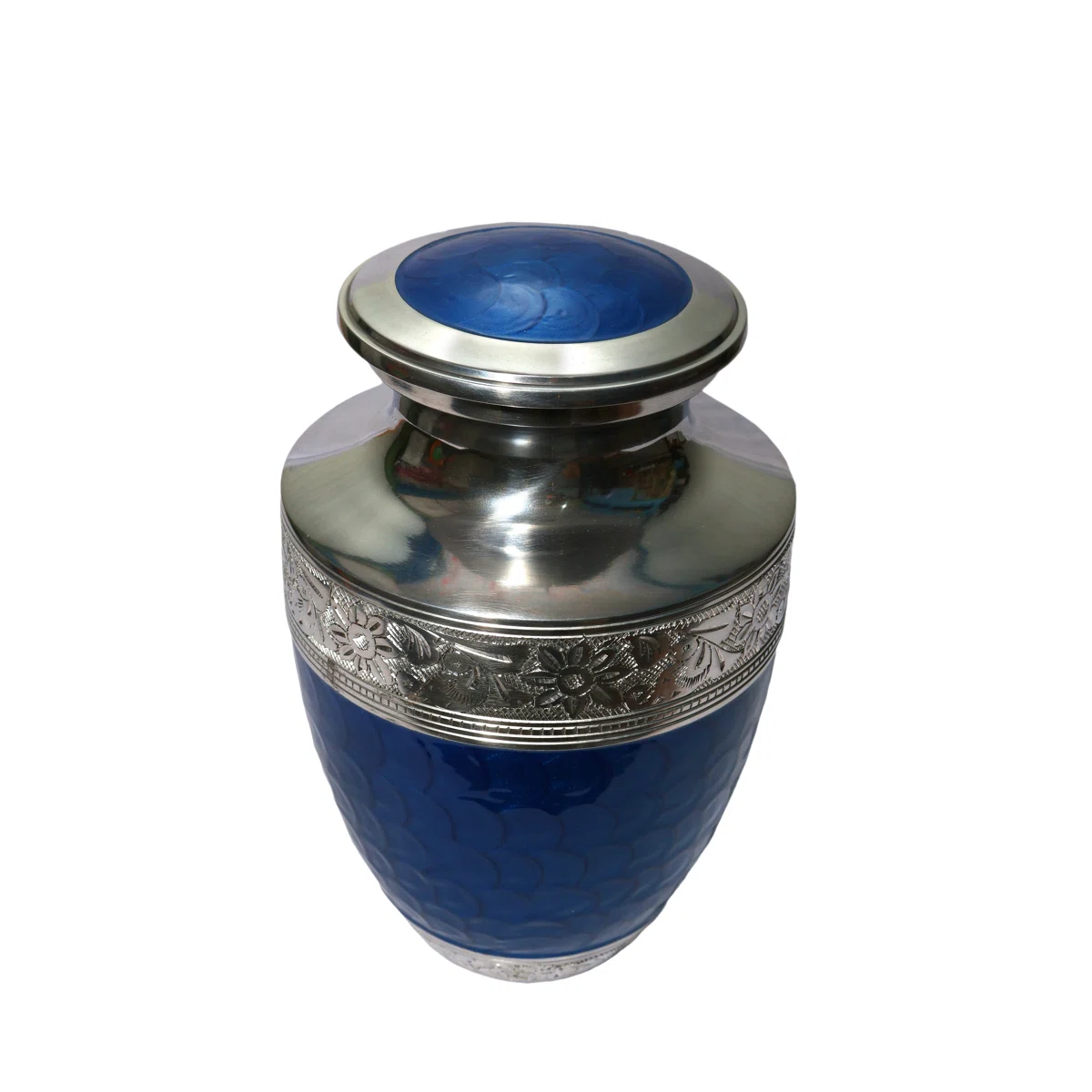 This stunning, full-sized aluminum urn features a highly polished silver-tone upper section and threaded lid, contrasting beautifully with a vibrant metallic royal blue lower body. The blue section has a subtle hammered texture for added depth and shine. The two finishes are elegantly divided by a wide, antiqued silver band showcasing a deep and intricate engraved floral and vine motif. This durable and visually impressive urn offers a secure and lasting tribute.