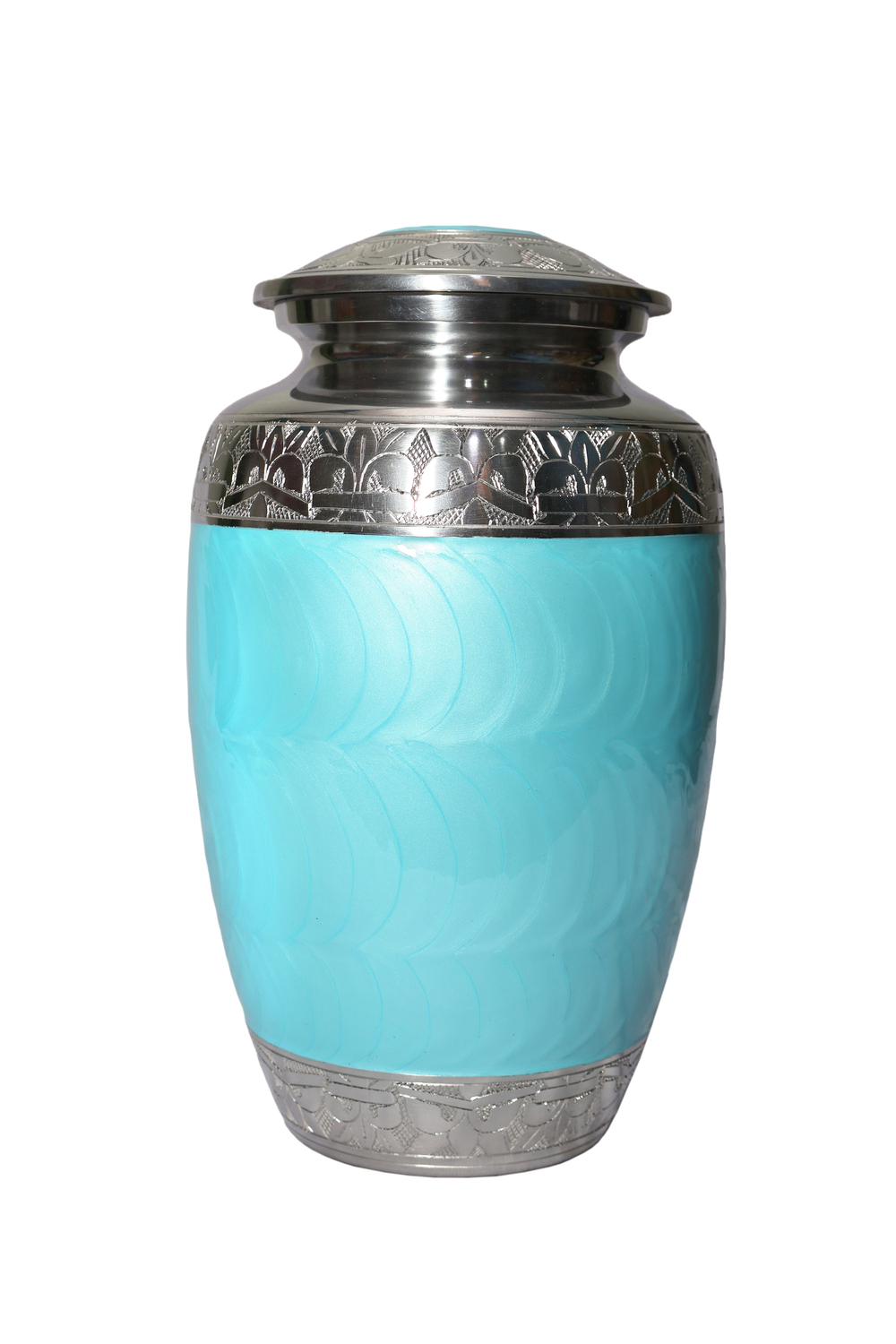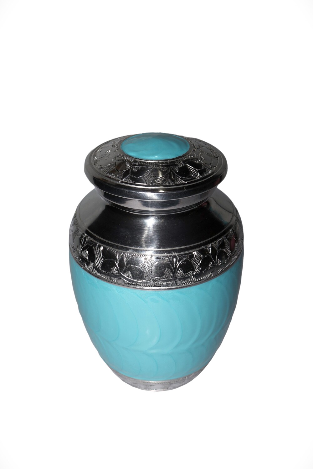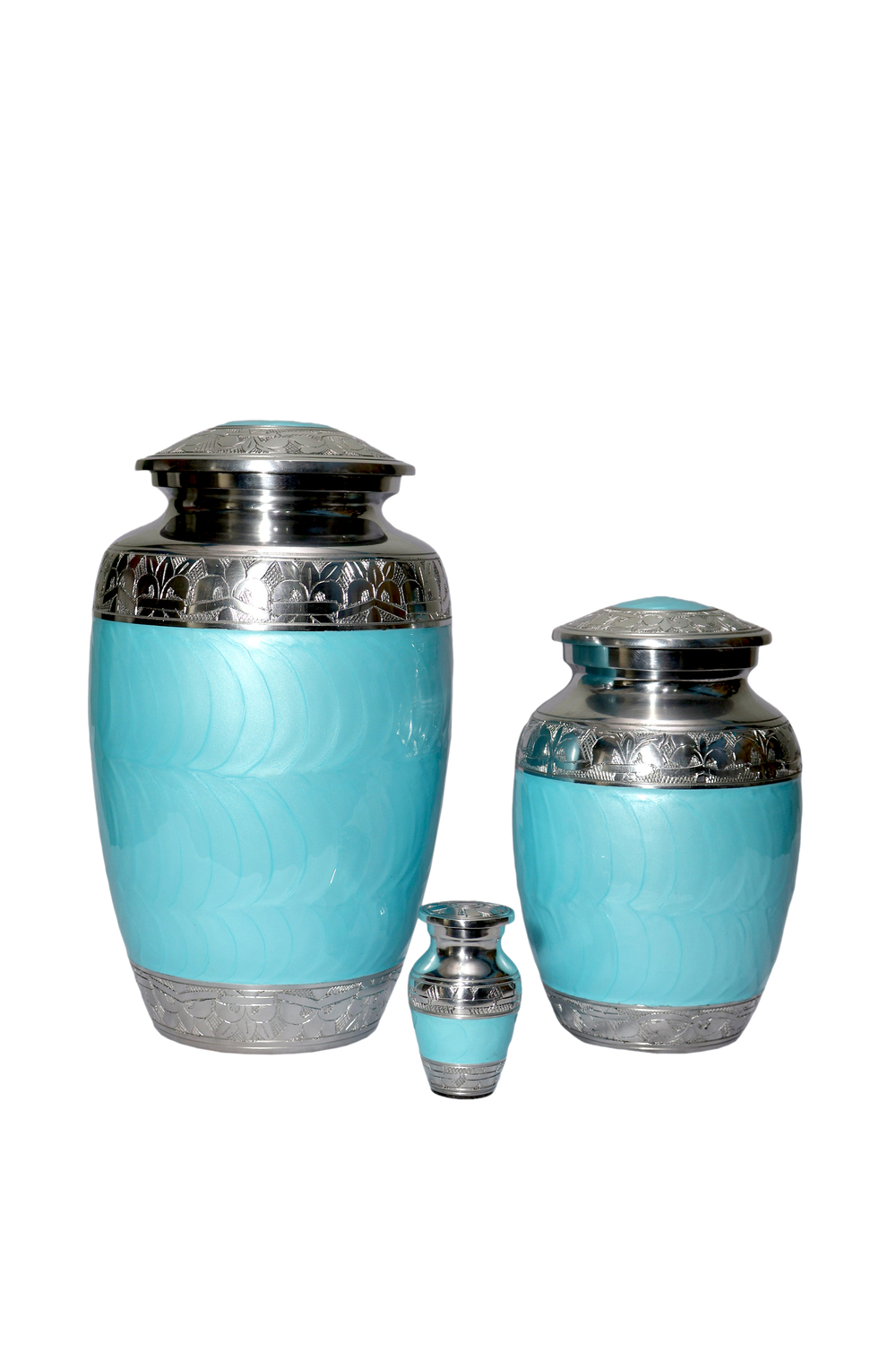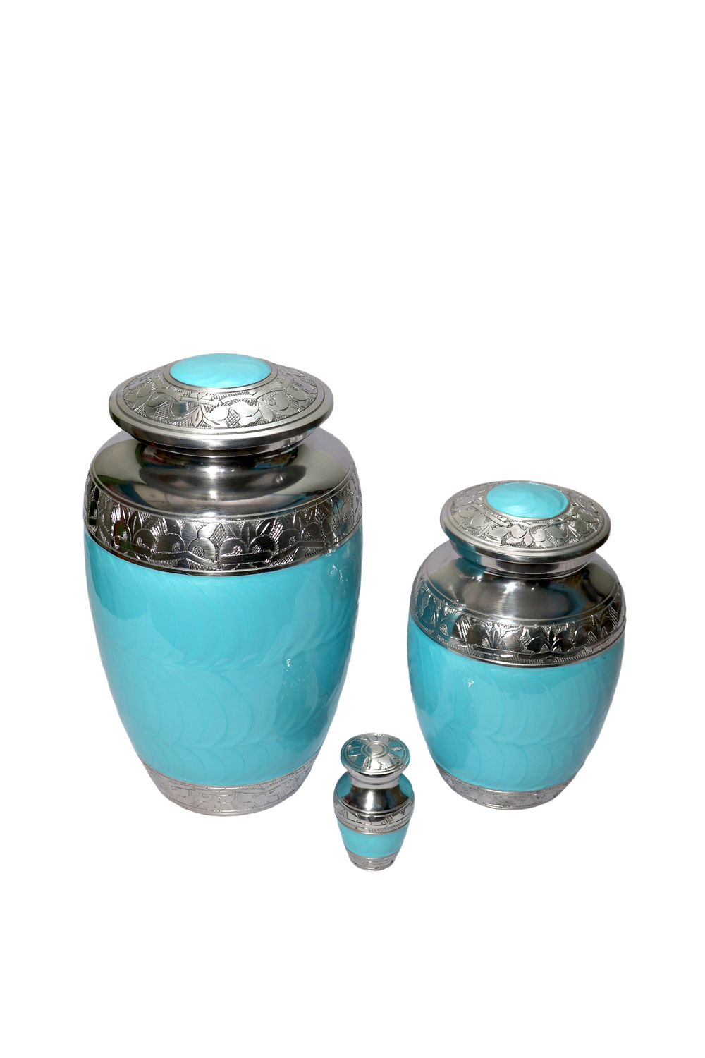 | This Embrace Memorial Urn Set is a beautiful three-piece collection crafted from aluminum. It includes 10-inch, 7-inch, and 3-inch urns. Each urn features a shimmering aqua blue body with a subtle, engraved swirl design. The tops, lids, and decorative bands are a polished silver tone with intricate hand-engraved floral and leaf patterns, providing exceptional detail to this dignified tribute. |