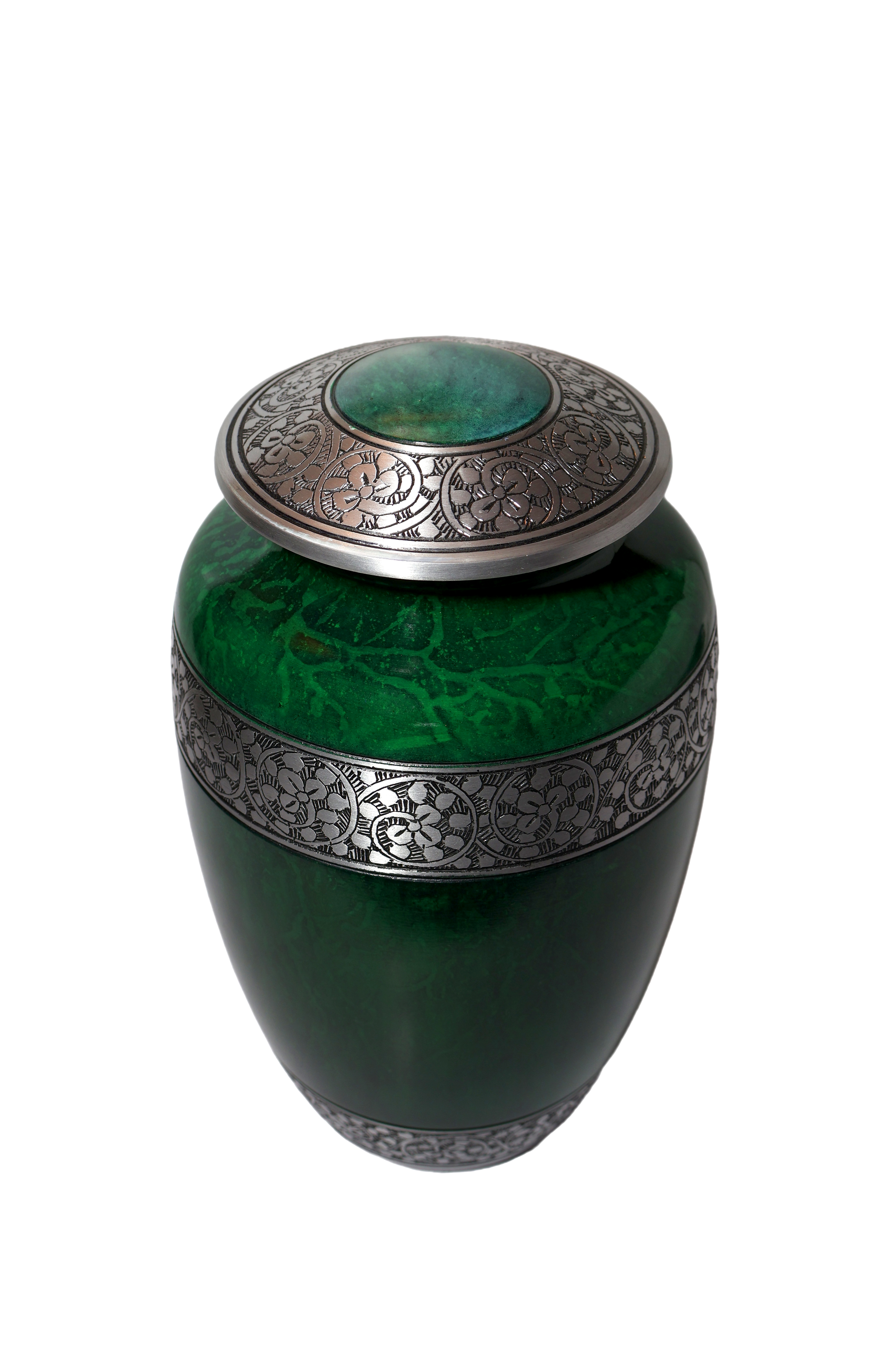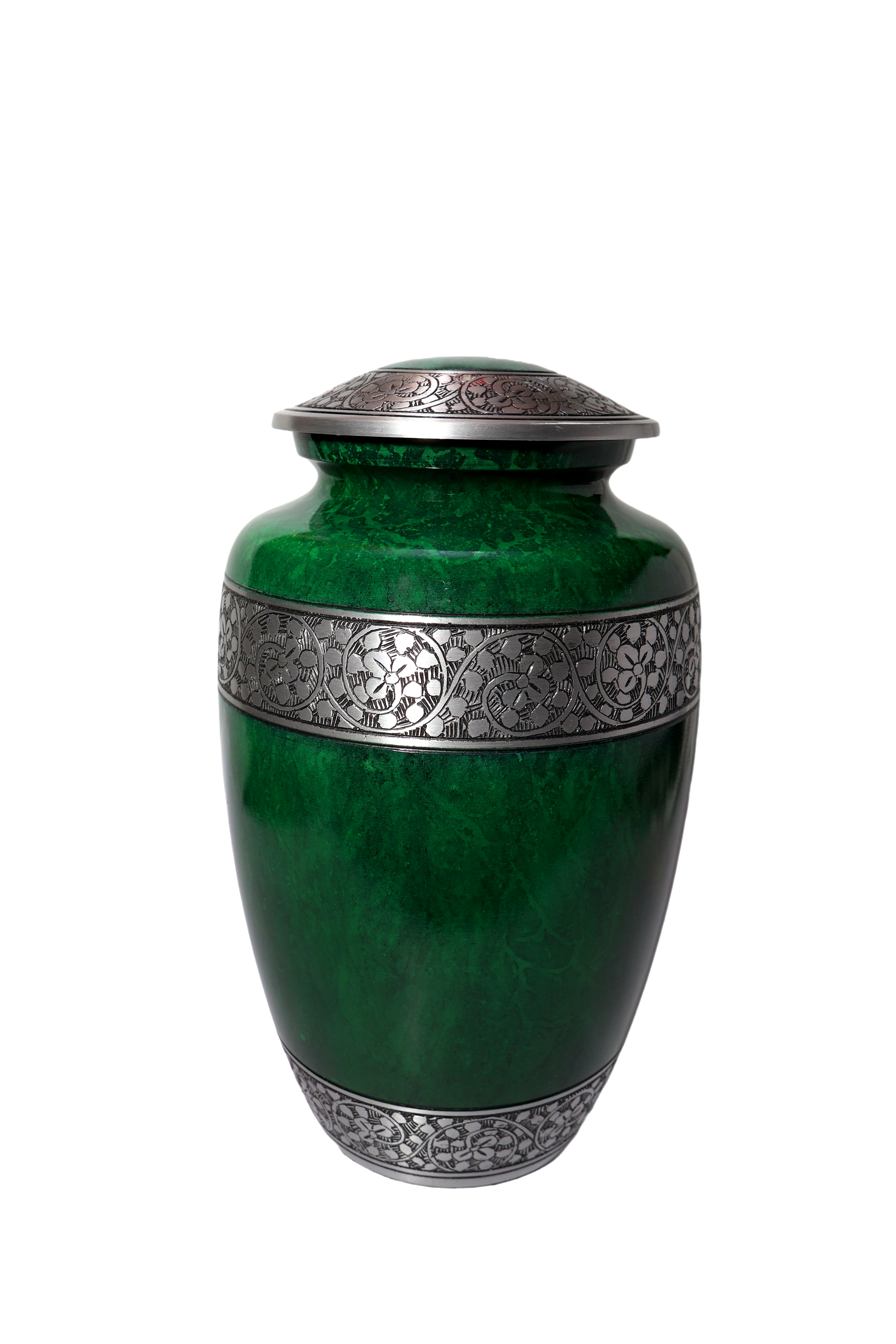 This exquisite, full-sized aluminum urn features a deep, high-gloss emerald green finish with a rich marble-like swirling effect. The vibrant body is beautifully accented by wide antiqued pewter-tone bands on the lid, mid-section, and base. Both the lid and the central band are intricately detailed with an engraved repeating floral or scroll motif. This durable and visually luxurious urn provides a secure and distinctive resting place.