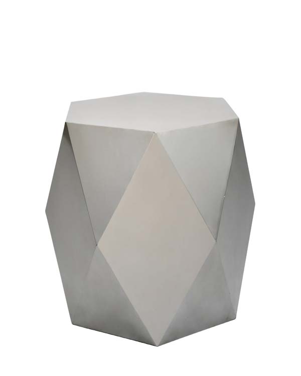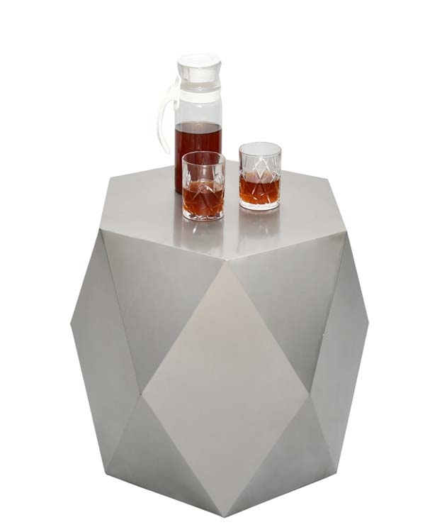 Modern and eye-catching, this geometric silver accent table features a faceted design with sharp, angular planes that create a bold sculptural look. The sleek metallic finish adds a polished, contemporary edge, making it a versatile piece for living rooms, lounges, or offices. Its sturdy construction offers a reliable surface for drinks, décor, or books, while the compact size makes it ideal for small spaces. Both functional and stylish, this table doubles as a side table or decorative pedestal.